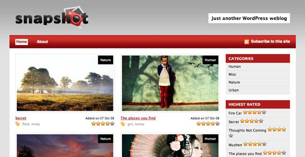 Un tema ideal para fotógrafos y fotoblogs, instantáneas de Woo temas también pueden ser objeto de un uso como una cartera o una galería de diseño. También viene con tres esquemas de color única para elegir, así como las opciones para cambiar de fotolog y la utilización de la cartera.
