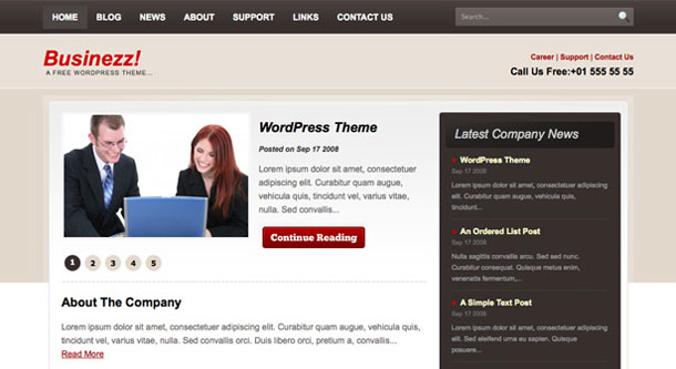 Businezz es un tema simple, WP estilo corporativo de Blog Oh Blog. Incluye una serie de opciones de personalización, incluyendo un pase de diapositivas, testimonios y noticias de la compañía en la barra lateral.
