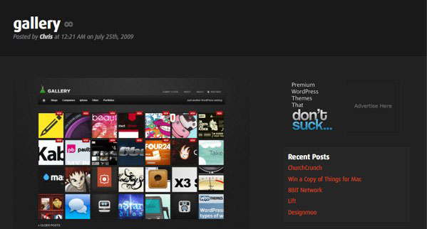 La Galería de WordPress tema escaparate de estilo se basa en el Marco temático y fue diseñado específicamente para Smashing Magazine. Otro gran tema de una cartera o escaparate visual, Galería es un tema altamente flexible y personalizable que admite vídeo de pantalla ancha con incrustación de la instalación de un plug-in gratuito.