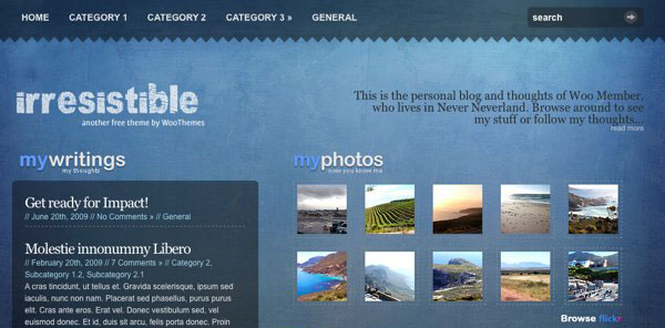 Para un blog personal único aspecto, visita el tema irresistible libre de la gente en temas Woo. Cuenta con lugares dedicados para sus fotos, videos y eventos corriente vital junto con el contenido de su blog típico. Con un diseño agradable, limpio, este tema ofrece algo un poco diferente de su diseño típico blog de 3 columnas.
