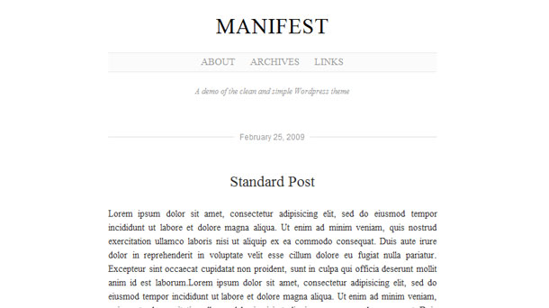 El objetivo con el Manifiesto era crear un tema limpio y aerodinámico que se centró en el contenido y no a las distracciones. Se utiliza una sola columna, a 500 píxeles de ancho diseño. No hay barras laterales. No widgets.