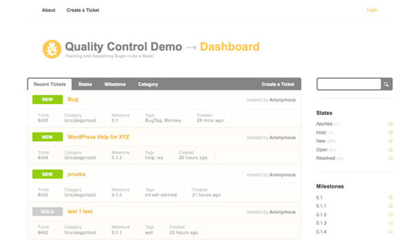 Control de Calidad es un tema gratuito que convierte cualquier instalación de WP en un sistema de mesa de ayuda de billetes. Incluye todo lo que usted esperaría en un sistema de emisión de billetes, incluidos los hitos, estatutos, categorías, y la capacidad de los usuarios para crear entradas.