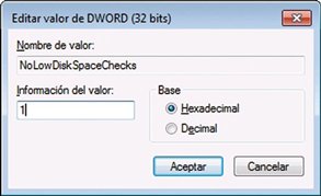 Windows comprueba periódicamente si estamos llegando a una cuota baja de disco duro y, llegado el caso, nos muestra un mensaje de advertencia. Si queremos ahorrar ciertos recursos realizando esta acción por nuestra cuenta podemos acceder a la clave HKEY_CURRENT_USER\Software\Microsoft\Windows\CurrentVersion\Policies\Explorer y, en el panel derecho, crearemos un nuevo valor DWORD con la entrada NoLowDiskSpaceChecks. Tras esto estableceremos su valor a 1.