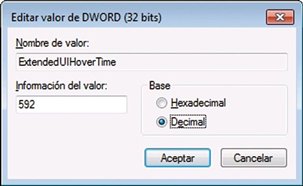 Para esto, accederemos a la clave HKEY_CURRENT_USER\Software\Microsoft\Windows\CurrentVersion\Explorer\Advanced, y crearemos una nueva entrada DWORD con el nombre ExtendedUIHoverTime. Al editarlo deberemos establecer el valor a Decimal y le asignaremos el contenido en milisegundos deseado. Por defecto este valor es 400.