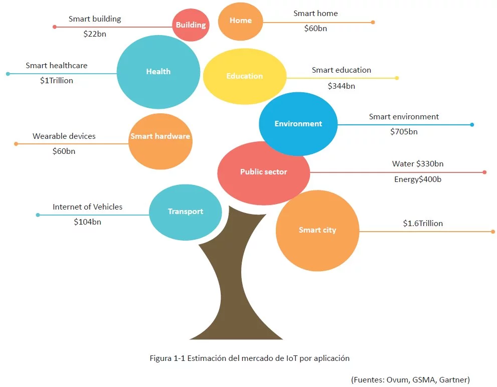 La gran popularidad de los dispositivos móviles y el consecuente abanico de plataformas y servicios que se han desarrollado alrededor de ellos está estimulando el crecimiento rápido del mercado de la IoT. Gartner, Inc. estima que en el mundo habrá 20.800 millones de dispositivos conectados para 2020. Esto representa una tasa de crecimiento anual compuesto (TCAC) del 34 %. La Figura 1-1 muestra una estimación del mercado de IoT según su aplicación.