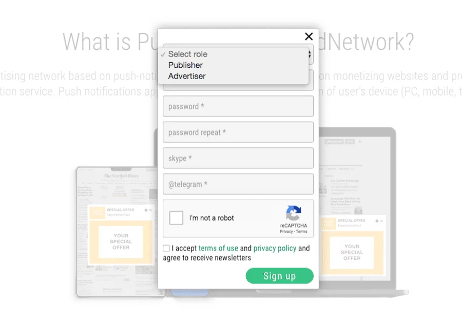 Además, aceptan el tráfico de todas las ubicaciones geográficas, asegurándose de que cualquier sitio web pueda aprovechar sus anuncios de notificación push. El proceso para comenzar a usar EvaDav es muy simple, solo siga el proceso de registro rápido y estará listo.