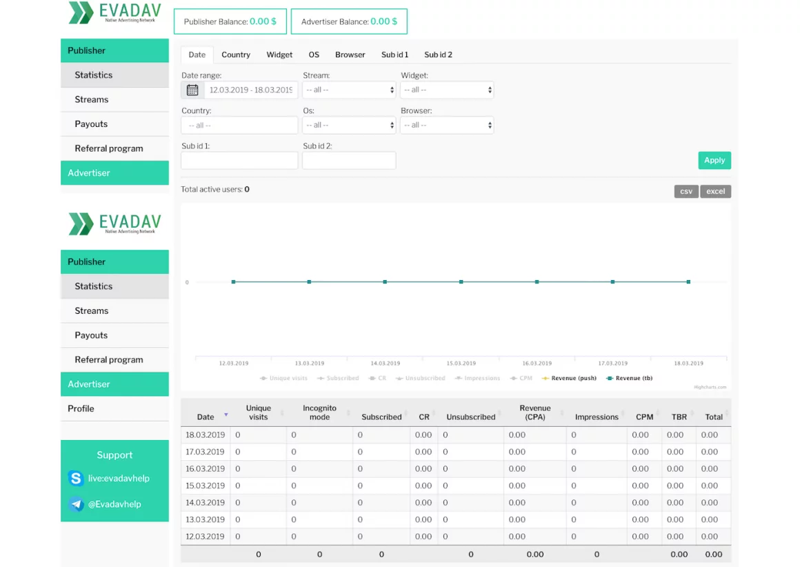 Una vez que finalice el proceso de registro, se lo dirigirá al panel de control de EvaDav donde puede crear su campaña y controlar sus estadísticas. Tiene la opción de pasar por estadísticas detalladas basadas en muchos parámetros diferentes, como el país, el widget, el sistema operativo y más.