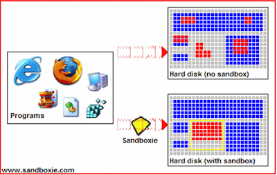 Las flechas rojas indican los cambios que se derivan de un programa en ejecución en el equipo. El cuadro de la etiqueta De disco duro (sin caja de arena) muestra los cambios de un programa que se ejecuta con normalidad. El cuadro de la etiqueta De disco duro (con caja de arena = cuadrado amarillo) muestra los cambios de un programa que se ejecuta bajo este programa. La animación ilustra que el programa es capaz de interceptar a los cambios y aislar dentro de una caja de arena Representado como un rectángulo amarillo. También ilustra que la agrupación de los cambios juntos hace que sea fácil de borrar todos a la vez.
